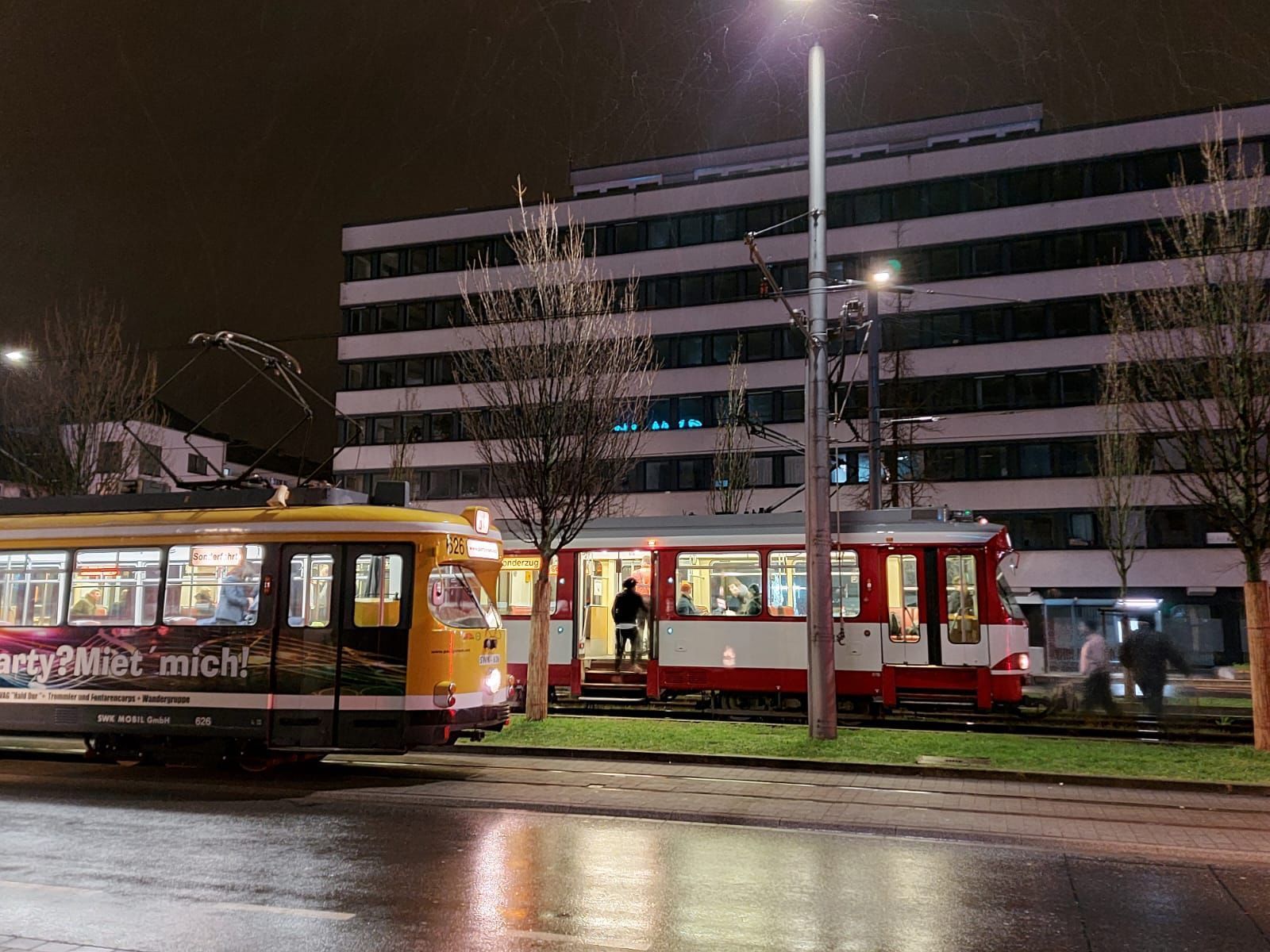 Kleine Überraschung mit großer Wirkung! Am Freitagabend machten sich spontan um circa 21 Uhr vier unserer Vereinskollegeninnen und Kollegen mit unserer Partytram (ehem. Fahrschulwagen/Tw626) auf den Weg vom Betriebshof der SWK Mobil GmbH zum Ostwall/Rheinstraße. Hier wollten unsere Kolleginnen und Kollegen den letzten Sonderzug des Typs GT8SU der Rheinbahn nach Krefeld zum Abschied in Empfang nehmen und so die Fahrgäste und Mitglieder des Vereins LinieD überraschen. So kam es zu dem historischen letzten Treffen der beiden Fahrzeuge auf dem Ostwall in Höhe der Kehranlage der Rheinbahn. Viel Begeisterung war allen Beteiligten anzumerken. Nach der Umstellung von LZB auf ZUB, wird es der LinieD nicht mehr möglich sein, den Streckenabschnitt von Düsseldorf nach Krefeld zu befahren.