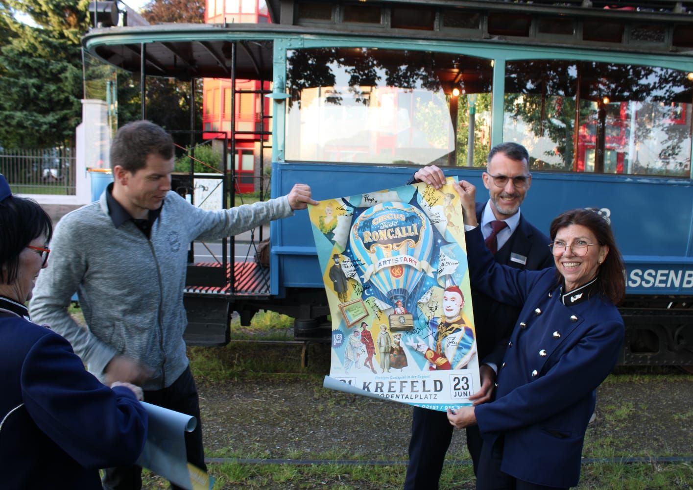 Am Sonntag, den 9. Juni, schließlich holte die Linie1 die Roncalli-Truppe nach der Vorstellung gegen 18 Uhr mit beiden historischen Bahnen ab, um mit diesen ungewöhnlichen, gleichermaßen fröhlichen wie freundlichen Menschen unterschiedlichster Nationen zu einer über zweistündigen Rundfahrt durch unsere Stadt zu starten. Die ausgelassene, tolle Stimmung während der Fahrt und die ganz besonderen Fahrgäste werden den beteiligten Ehrenamtlern der Linie1 lange in bester Erinnerung bleiben.